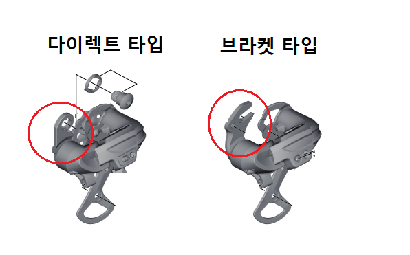 뒷 변속기 / 뒷 드레일러의 고정 방식에 따라 다이렉트 타입과 브라켓 타입으로 나누어집니다. 각 자전거의 프레임 스펙에 맞는 드레일러를 사용해야 하며, 기존 드레일러의 장착부 모양으로 확인할 수 있습니다. 아래 이미지를 참고하시면 다이렉트 타입과 브라켓 타입의 차이점을 알 수 있습니다.
