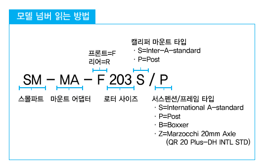 디스크 브레이크의 어댑터의 모델넘버를 읽는 방법을 안내드리겠습니다. SM-MA-F203S/P를 예로 들어 설명드릴 수 있습니다. SM은 스몰파트, MA는 마운트 어댑터의 약자입니다. F,R는 프론트와 리어의 구분이며 그 뒤에 숫자는 로터 사이즈 입니다. 마지막으로 캘리퍼 마운트 타입과 서스펜션/프레임 타입의 약자입니다.