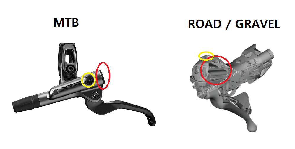 2. 브레이크 간격이 좁아졌을 때(휠을 뺀 상태에서 브레이크 조작 등), 브레이크 레버의 블리드 스크류(노란원)를 열지 않은 상태에서 브레이크 캘리퍼의 피스톤을 밀어낸 경우