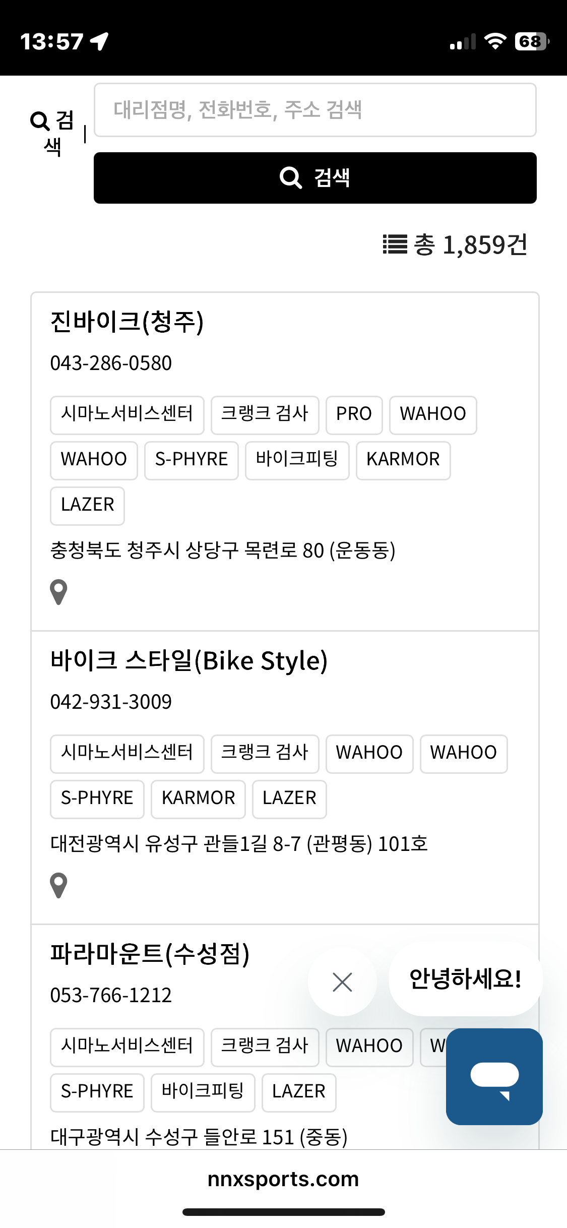 아래쪽으로는 시마노서비스센터 가나다 순서, 그아래로는 일반 대리점 가나다 순서로 모든 대리점에 나열됩니다.