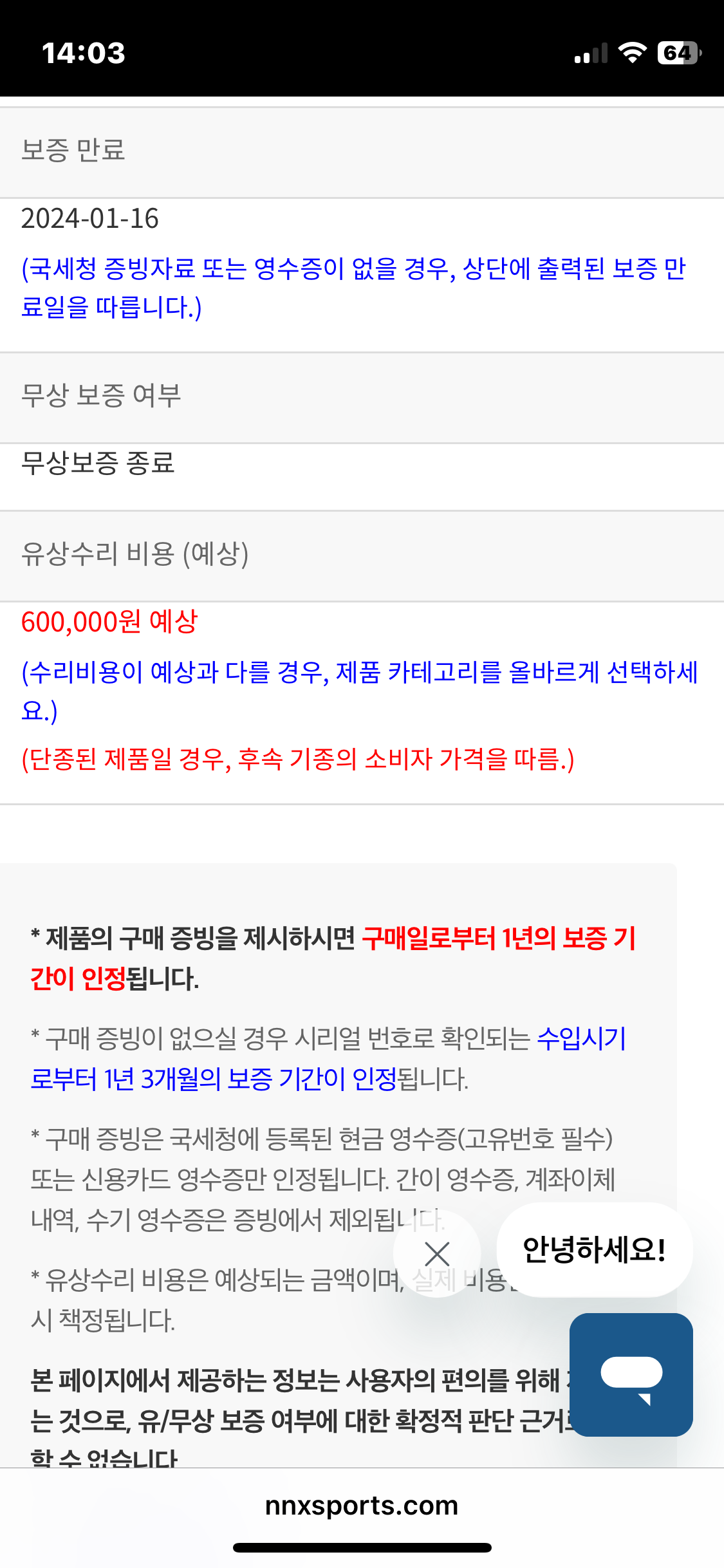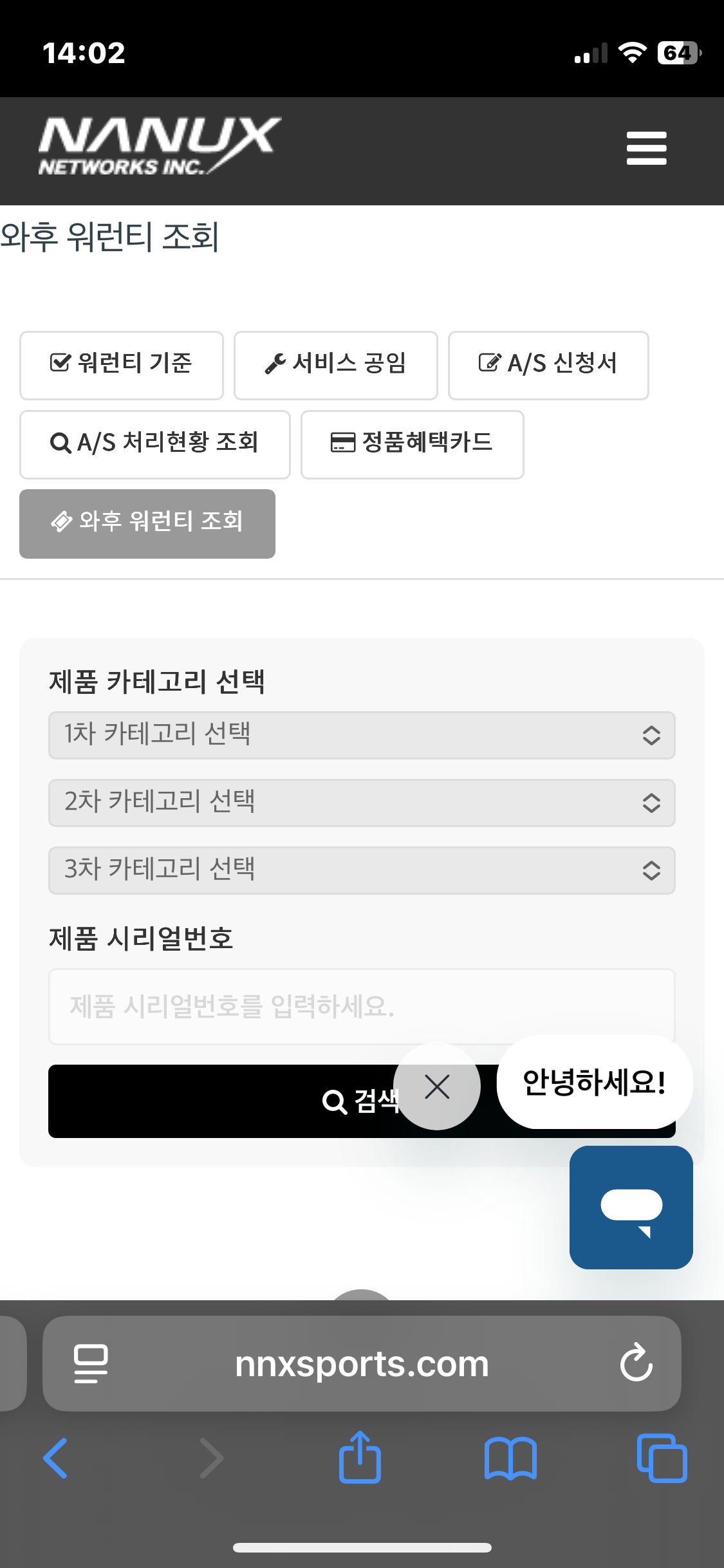 와후 워런티 조회 페이지또한 카테고리선택 및 시리얼번호 입력으로 무상보증기간 조회 및 예상되는 유상수리비용을 조회할 수 있습니다.
