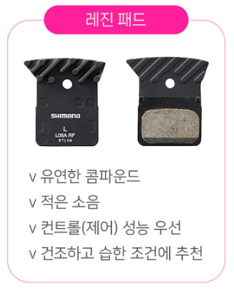 레진 패드는 일반적으로 메탈 소재 패드 대비 부드러운 편이며,이로 인해 브레이크 소음이 낮은 장점이 있습니다.