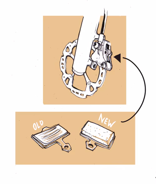 디스크 브레이크 패드 표면이 닳고 닳아 약 0.5mm 보다 얇아지면, 금속 스프링 고정 패드가 로터에 직접 닿게 되어 로터를 손상시키기 때문에, 디스크 브레이크가 더 이상 얇아지기 전까지 교체해야 합니다.