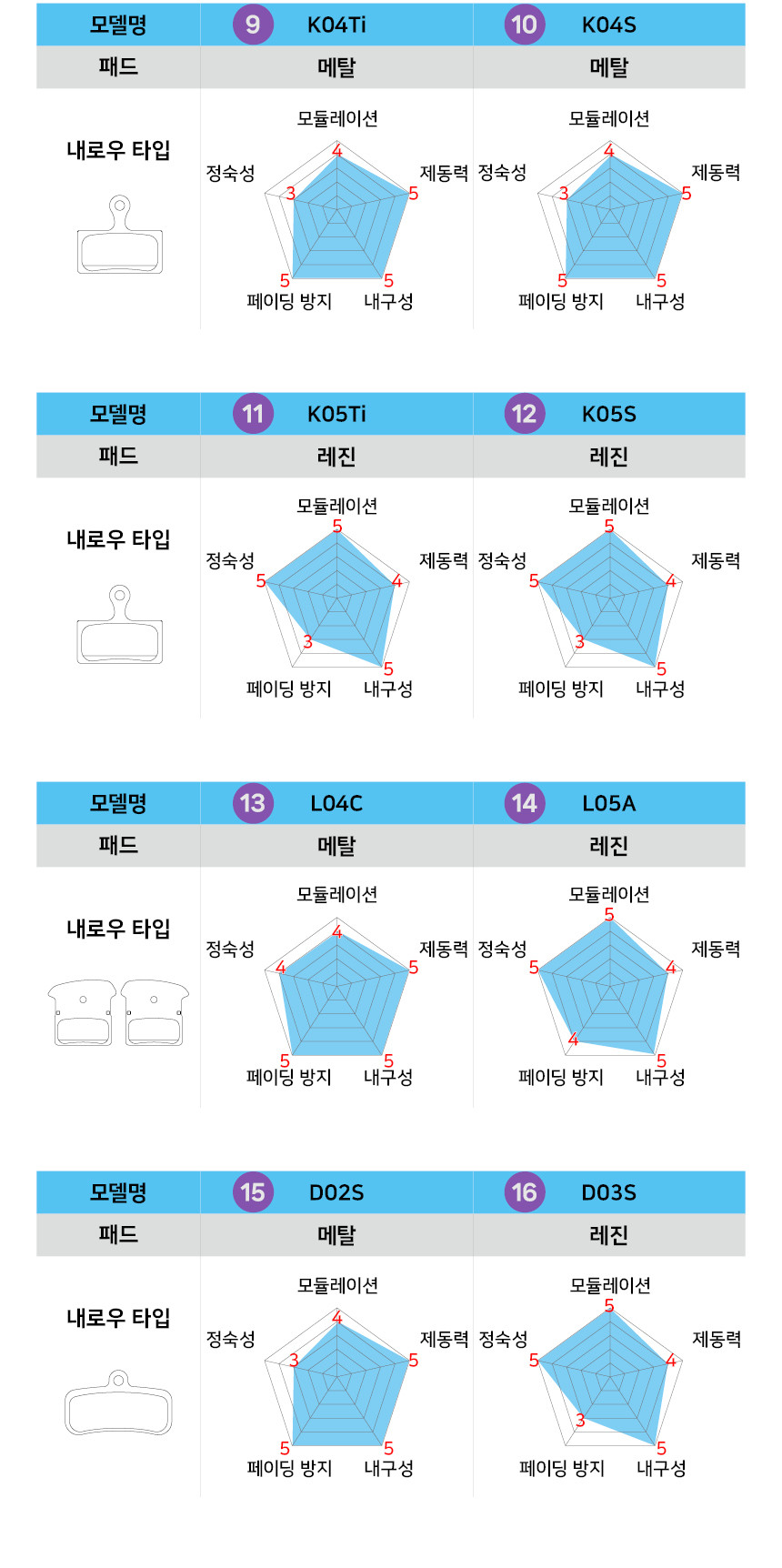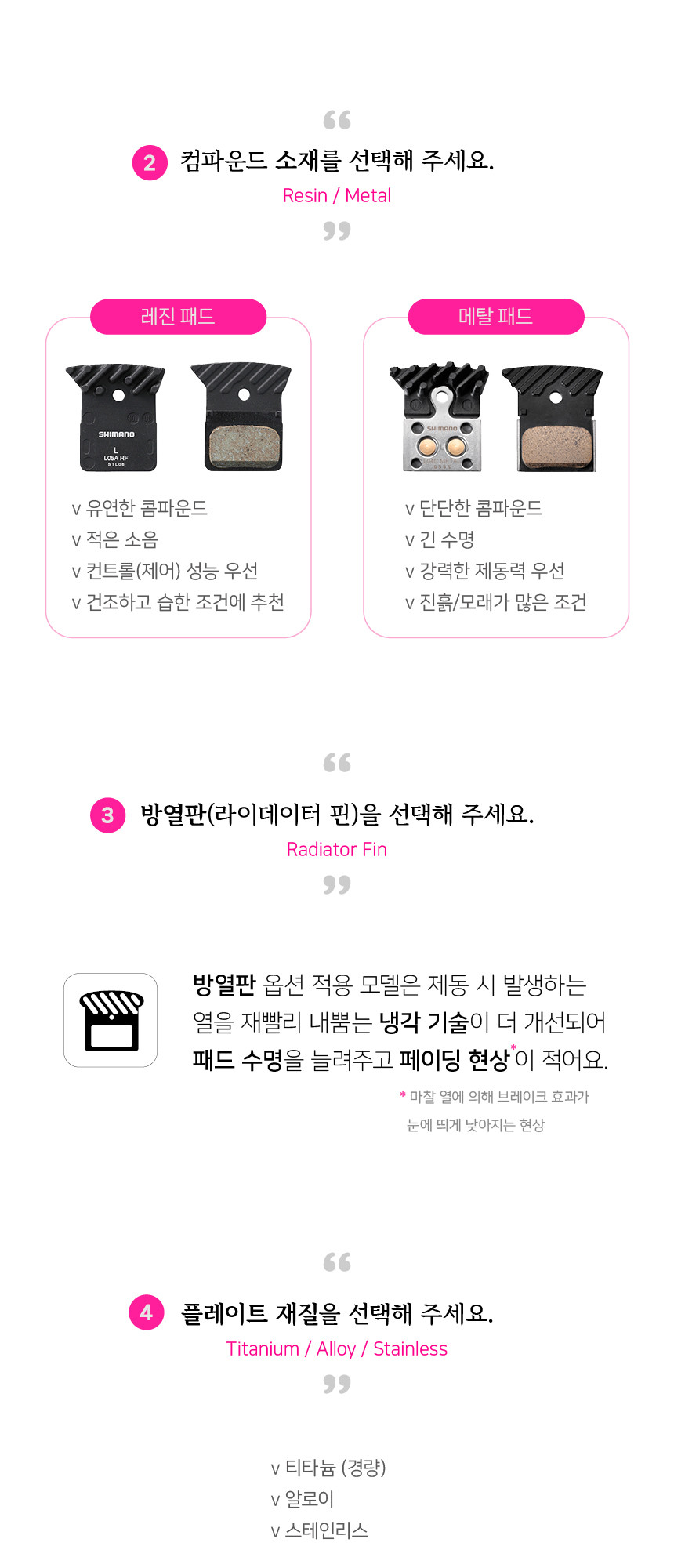 메탈과 레진 브레이크 패드는 동력 전달과 기타 특징에 있어 살짝 차이가 있기 때문에 미묘한 느낌과 제어의 특징이 있습니다. 따라서 개인적인 취향으로 메탈 또는 레진 패드를 선택하게 되는 것도 무방합니다.