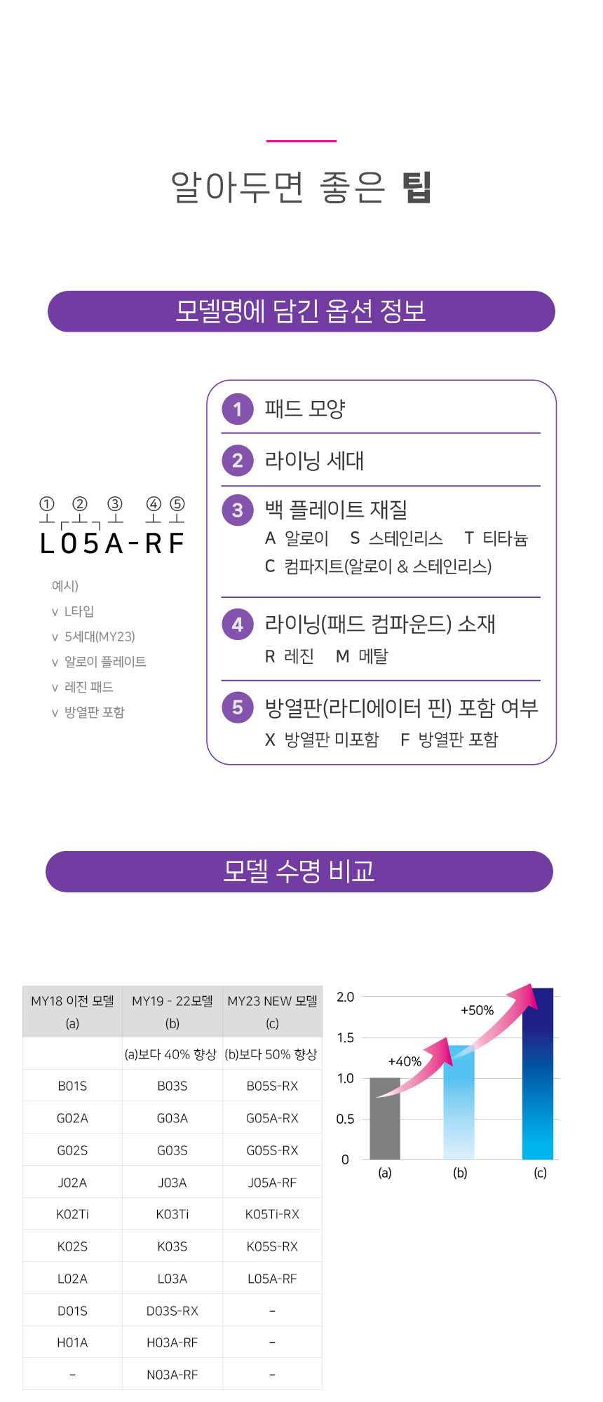 악조건이나, 심한 브레이크를 많이 밟아야 하는 경우에는 내구성이 더 강한 메탈 패드로 교체한 후 패드 교체 시기까지 안정적인 성능을 누리시기 바랍니다.