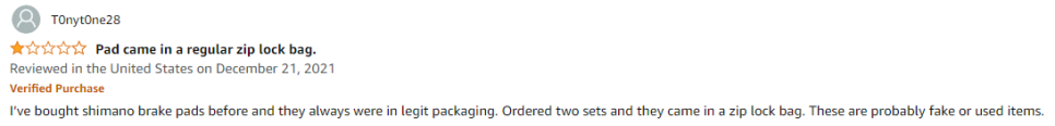 '이전에 시마노 브레이크 패드를 구입한 적이 있는데 항상 정품 포장에 들어 있었어요. 두 세트를 주문했는데 지퍼락 가방에 들어 있었습니다. 가품 같네요.'