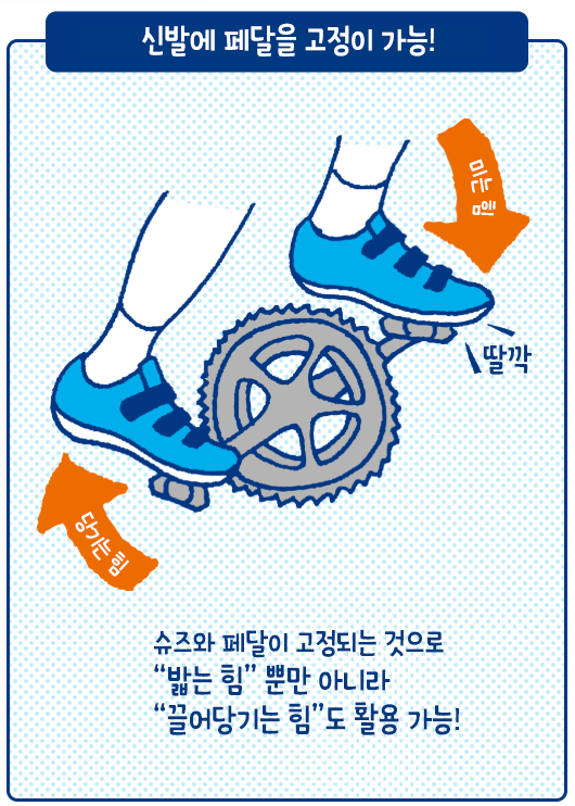 우천이나, 여러 상황으로 인해 신발이 젖어있거나 미끄러운 환경에서도 클리트 덕분에 사이클 슈즈와 페달은 견고하게 체결되어 있으면서, 페달을 미는 힘에 당기는 힘이 추가되어 라이딩 속도를 크게 향상시키는 장점을 가졌습니다.