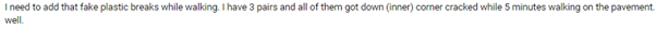 전 가짜 플라스틱이 걷다가 깨진다는 사실을 추가하고 싶습니다. 나는 3 쌍을 가지고 있는데 모두 포장 도로를 5 분 동안 걷는 동안 아래쪽 (안쪽) 모서리에 금이 갔습니다.