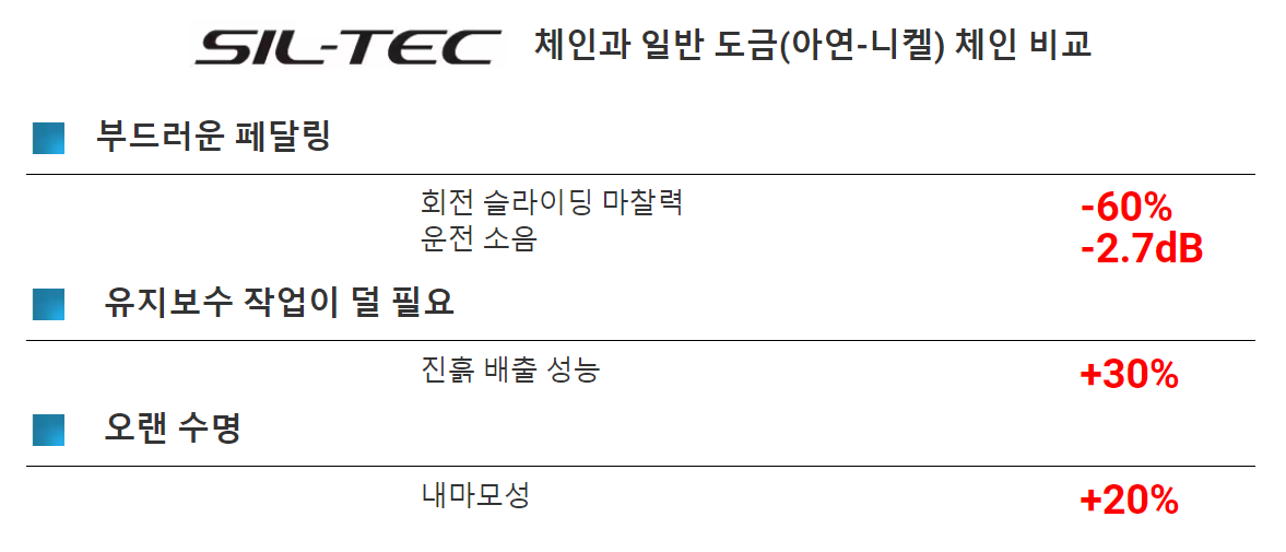 체인은 관리 여하에 따라 수명을 효과적으로 연장할 수 있습니다. 체인을 중성 세제로 세척하고 윤활하는 등의 관리를 통해 장시간에도 새것 같은 체인 경험을 유지해 보시는 건 어떨까요?