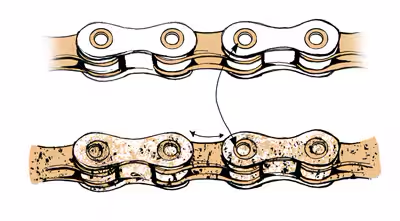 체인은 구동계 관련 부품 중에서 가장 먼저 마모가 발생하는 부품입니다. 체인은 일반적으로 약 1,000마일(1600km)의 라이딩이 가능하지만, 개인의 라이딩 스타일, 라이딩 조건 및 체인의 윤활 상태와 같은 다양한 요인에 따라 마모되는 속도가 달라질 수 있습니다. 마모가 시작되면 라이딩 시 체인 롤러 부싱의 금속 또한 마모되어 톱니가 잘 맞물리지 않게 됩니다.