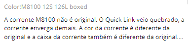 "M8100 체인이 정품이 아닙니다. 퀵 링크가 파손되어 체인이 너무 많이 구부러졌습니다. 체인의 색상이 정품과 다르며 체인 박스도 정품과 다릅니다."