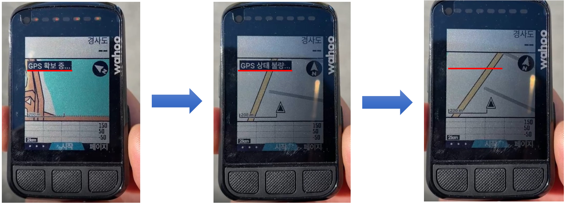 자전거 속도계의 경우 소형화된 센서의 사용으로 주변 환경의 영향을 크게 적용 받을 수 있습니다.그럼에도 정확한 GPS 신호 수신을 위해서는 라이딩 시작 전 아래 절차를 진행 후에 사용해주시기 바랍니다.지도 페이지의 상태 메시지가 없어진 후 라이딩을 시작하시기 바랍니다.