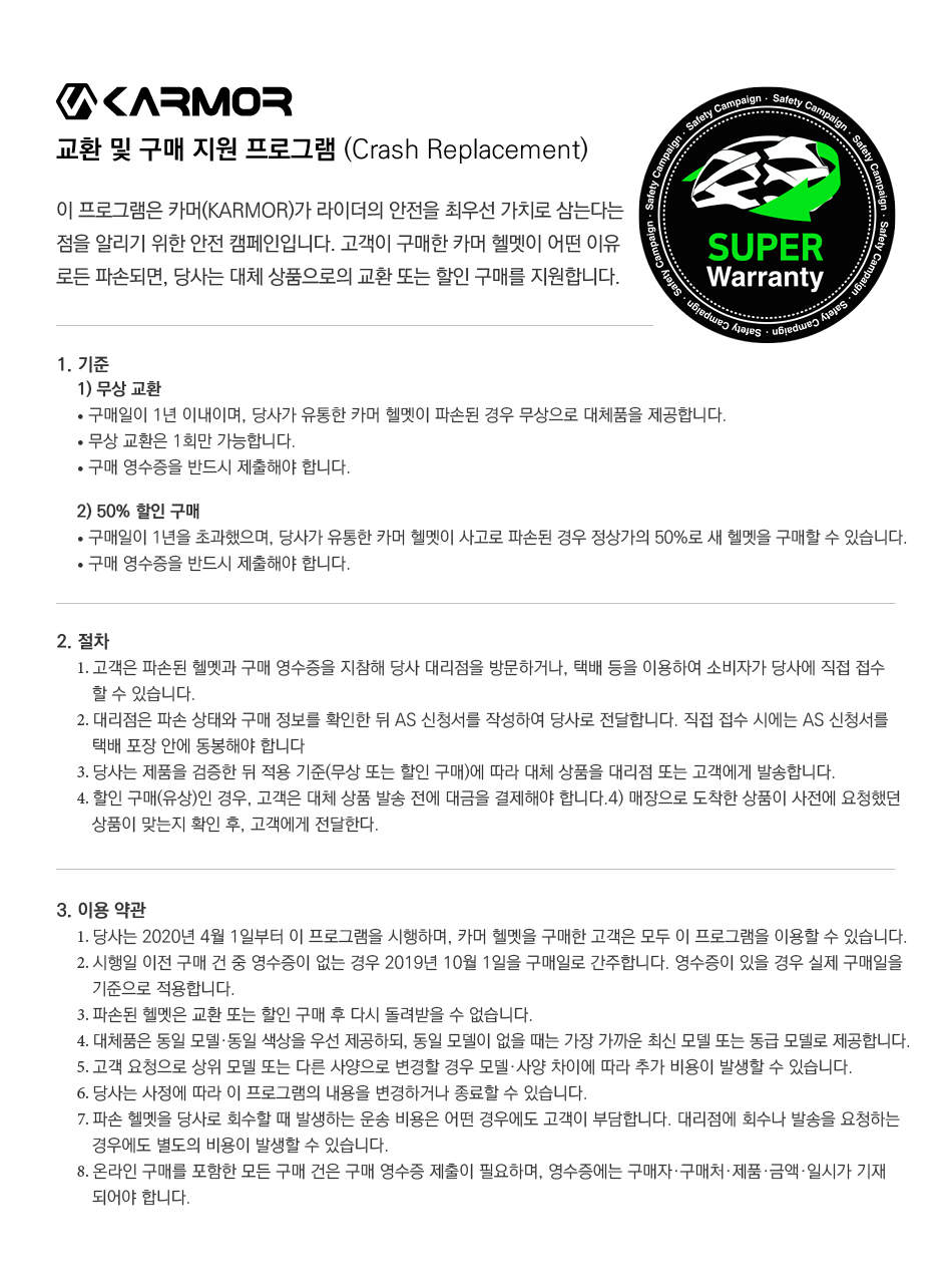 이 프로그램은 카머(KARMOR)가 라이더의 안전을 최우선 가치로 삼는다는 점을 알리기 위한 안전 캠페인입니다. 고객이 구매한 카머 헬멧이 어떤 이유로든 파손되면, 당사는 대체 상품으로의 교환 또는 할인 구매를 지원합니다.