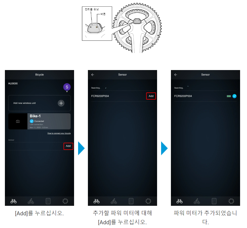 *E-Tube Ride 작동 전에 파워미터 컨트롤 유닛의 버튼을 눌러 블루투스 연결 대기 상태로 들어가 주세요.