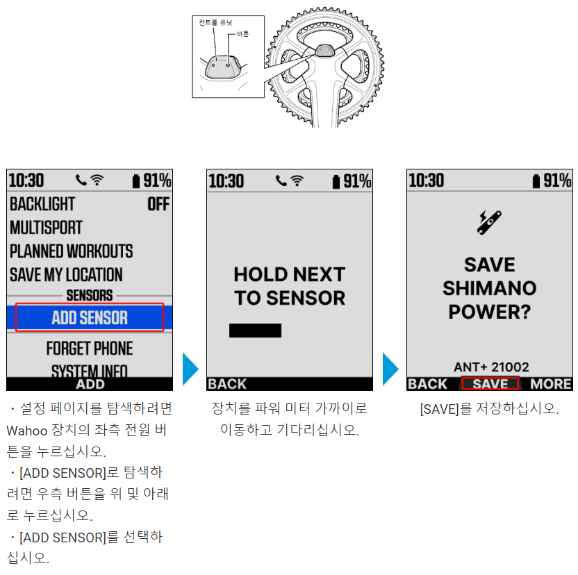 * 파워미터 컨트롤 유닛의 버튼을 눌러 블루투스 연결 대기 상태로 들어간 후 와후 장치의 센서 설정에서 파워미터를 선택 하십시오.