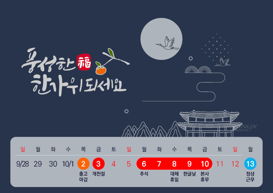 10월 추석 및 공휴일로 아래와 같이 배송일정, AS처리 휴무 안내드립니다.