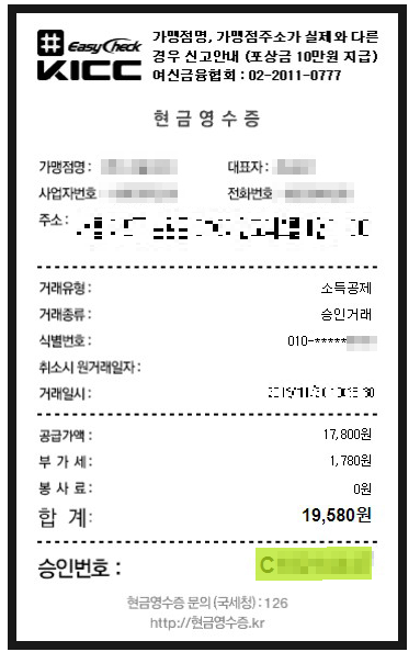 참고:국세청 등록 현금 영수증은 아래와 같은 정보가 반드시 포함되어 있습니다.