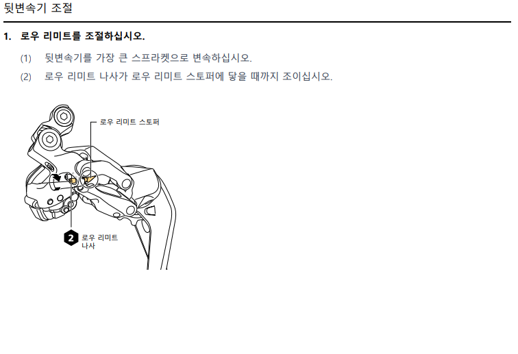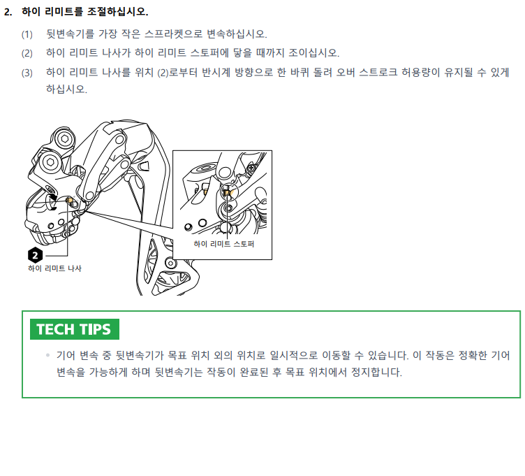 Di2 뒷드레일러가 마지막 단수에서 자동으로 한 단이 내려가거나 올라갑니다. 로우/하이 리미트 조절 나사가 적절하게 설정되어 있지 않아 발생되는 문제일 확률이 높습니다.로우/하이 리미트 조절 나사를 아래 그림을 참고하시어 조절해보시기 바랍니다.