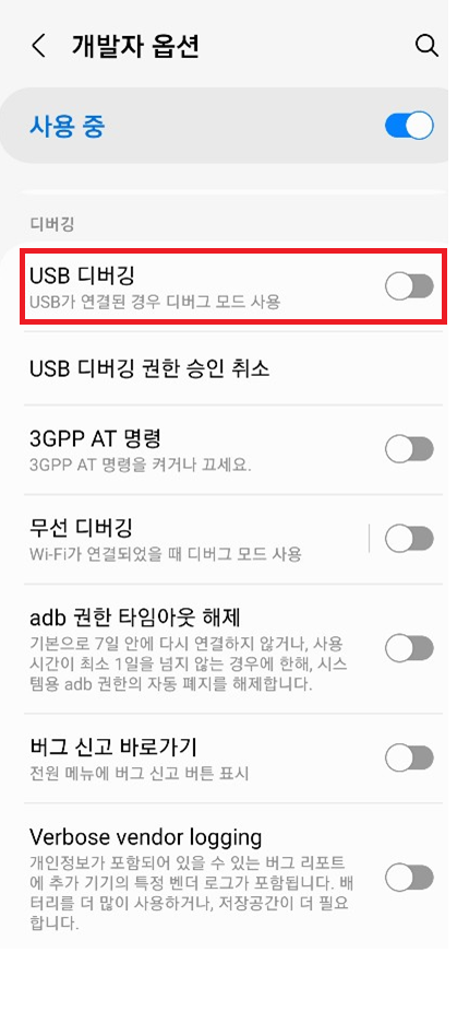 앱을 사용하기 전에 'USB 디버깅' 기능을 비활성화를 해주셔야 합니다.