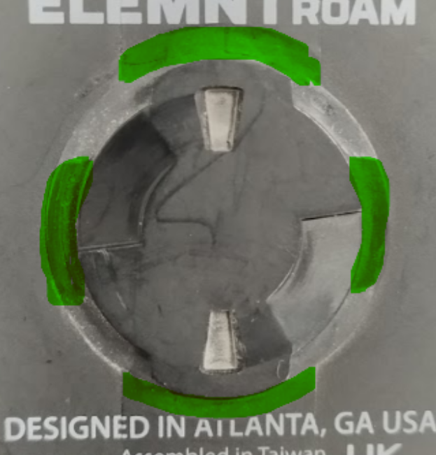 사진에서 녹색으로 강조된 부분은 금속 마운트에 의해 깎여나가서 높이가 낮아진 부분입니다. 이로 인해 엘리먼트 본체가 마운트에 제대로 결합되지 않거나, 결합되었다 하더라도 진동이 있을 때 과도하게 흔들릴 수 있습니다. 이러한 유형의 손상은 제조상 결함이 아니므로 보증 대상이 아닙니다.