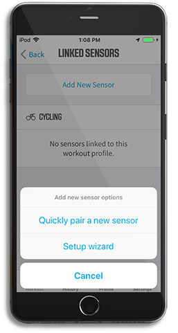 제품 신규 설치(Wahoo 트레이너및 KICKR BIKE에 유용함 )의 경우 설치 마법사를 선택하십시오. 앱 내에서 단계별 안내와 함께 제품 설치를 안내받을 수 있습니다.또는, 빠른 설정을 원하시면 새 센서를 빠르게 페어링 을 선택하십시오.본 가이드는 빠른 설정으로 진행합니다.