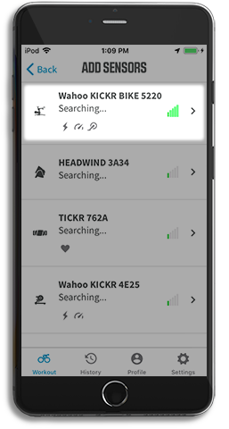 Wahoo fitness 앱을 열고 키커 트레이너의 전원이 켜져 있는지 확인합니다.