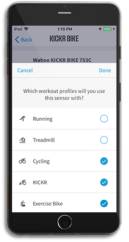 트레이너를 사용할 운동 프로필(예: KICKR)을 선택한 다음 오른쪽 상단 모서리에 있는 완료 를 탭 합니다.참고 : 앱 프로필 페이지에서 Wahoo Cloud에 로그인한 상태에서 새 트레이너를 페어링하는 경우 완료를 탭하면 트레이너도 자동으로 Wahoo에 등록되고 키커 제품에 연계된 프로모션 코드가 있을 경우 Wahoo Cloud와 연결된 이메일로 전송됩니다.